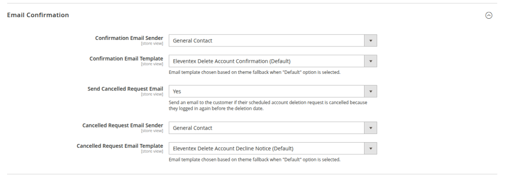 Confirmation Email Sender: choose the sender identity for the confirmation email.Confirmation Email Template: choose the email template used for the confirmation message.Send Cancelled Request Email: enable this if customers should be notified when their scheduled deletion request is cancelled after logging in again.Cancelled Request Email Sender: choose the sender identity for the cancellation email.Cancelled Request Email Template: choose the email template for the cancellation notice.