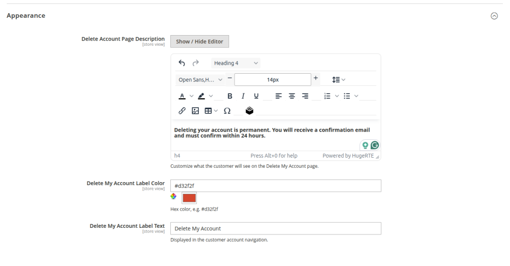 Delete Account Page Description: add the text shown on the customer delete-account page.Delete My Account Label Color: define the color used for the delete-account label or link.Delete My Account Label Text: define the text shown in the customer account navigation.