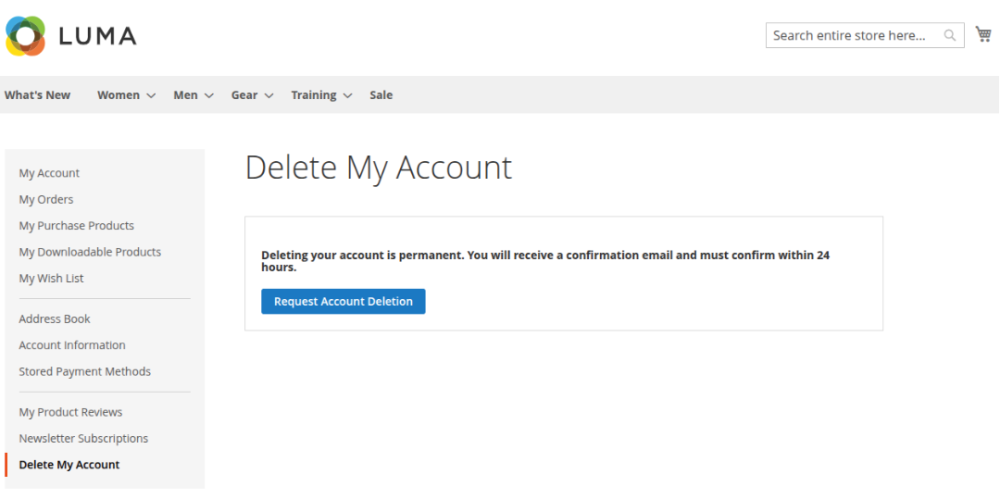 The extension allows customers to request deletion of their account from the storefront. The request is confirmed by email and can be processed immediately or after a delay, depending on the store configuration.