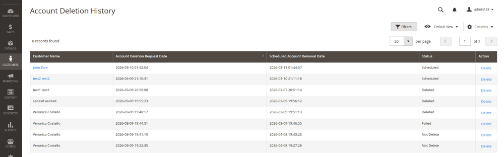 Stores > Configuration > Eleventex > Delete Account