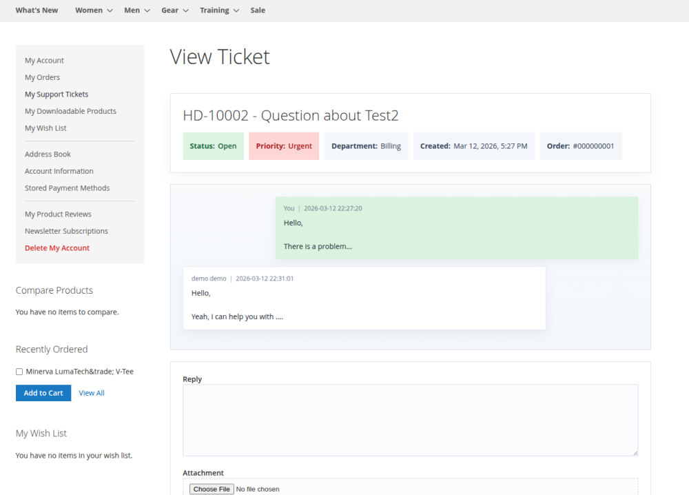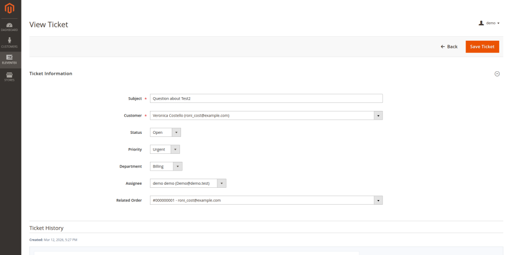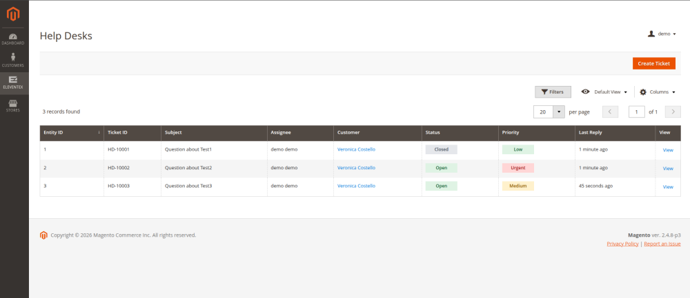 The module gives customers and store admins a shared ticketing workflow inside Magento: