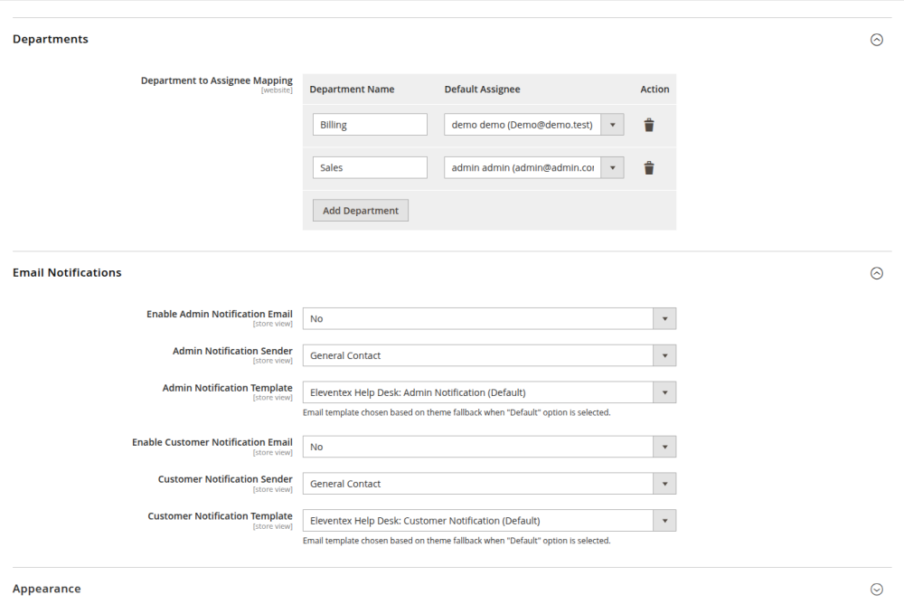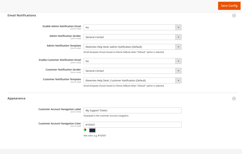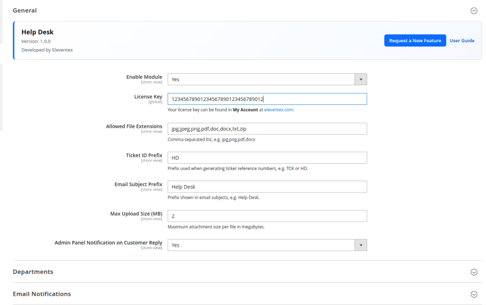 Enable ModuleSet toYesto enable storefront and admin Help Desk functionality.License KeyEnter the Eleventex license key if your project uses license validation.Allowed File ExtensionsEnter a comma-separated list such asjpg,png,pdf,docx.Ticket ID PrefixSet the prefix for generated ticket references, such asTCKorHD.Email Subject PrefixSet the prefix used in Help Desk emails.Max Upload Size (MB)Set the maximum attachment size allowed per file.Admin Panel Notification on Customer ReplySet toYesif admin inbox notifications should be created when a customer replies.