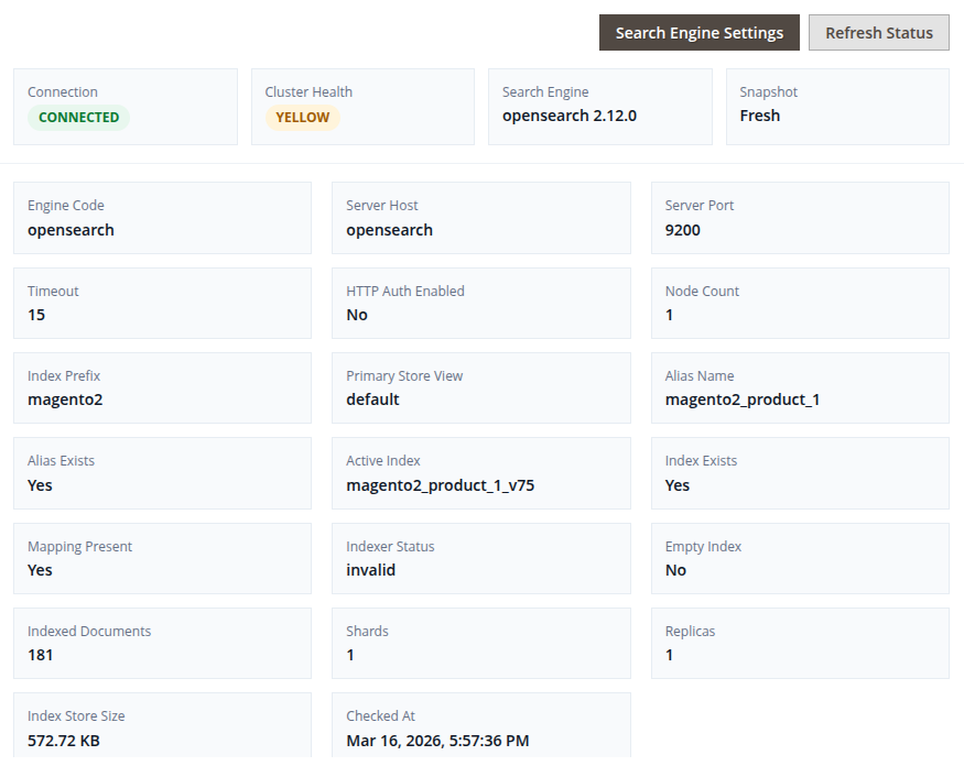 The module adds a diagnostics widget to the Magento admin that helps administrators quickly verify the health of the configured search engine (OpenSearch or Elasticsearch).