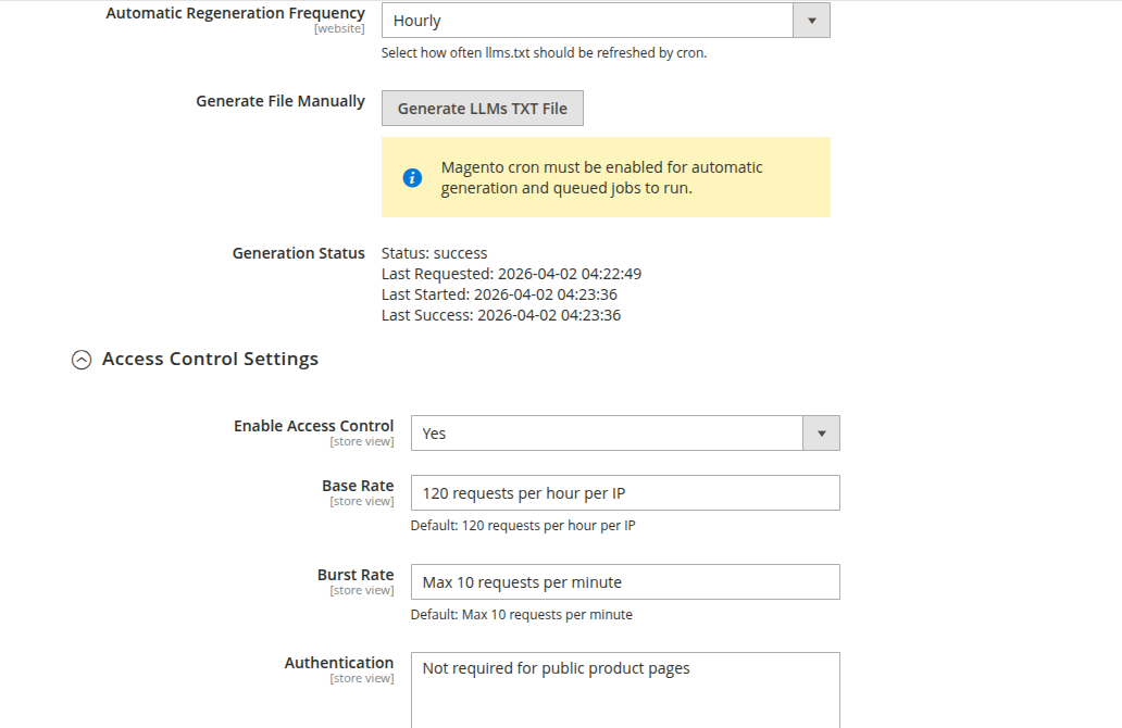 Easily manage llms.txt generation across multiple store views. The module supports structured output tailored to each store in your Magento multi-store environment.